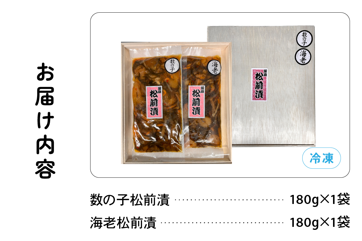 海老松前漬:海老(ベトナム産)、昆布、いか加工品、唐辛子、醤油、砂糖、醗酵調味液/ソルビット、調味料(アミノ酸等)、増粘多糖類、着色料(赤102・赤106・黄4・黄5)、甘味料(サッカリンNa)、保存料(ソルビン酸K)、(一部に小麦・大豆・サバを含む)