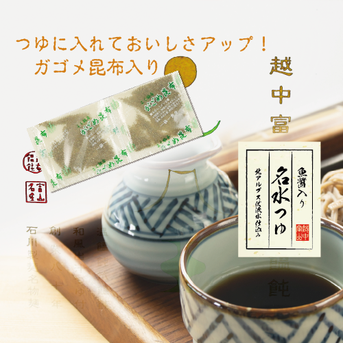 添付の「名水つゆ」は、「室鯖節」「昆布」「鰹節」をぜいたくに使ってだしをとり、「魚醤」を隠し味にした味わい深い仕上がりになっています。温かいうどんにもざるうどんにも最高の一品です。