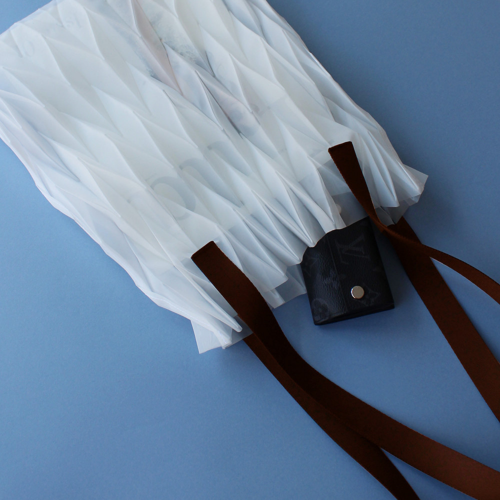 当返礼品は、自動車塗装用の手袋に使用される高密度ポリエステルメッシュを採用。厚さわずか90ミクロンという極薄素材を、専用ミシンと熟練の職人技で一枚ずつ丁寧に縫製しています。プリーツ加工を施し、超軽量ながら高い耐久性を実現。上品な透け感と独特の手触りをお楽しみいただけます。