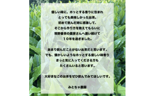 [天日干し釜炒り茶の製法] 一番茶の頃に摘んだ生葉を釜炒りして揉捻してからしっかり乾くようにハウスの中で天日干しして乾燥させます。ここまでは晒青緑茶と同じ工程です。そして飲む前に焙煎をします。軽焙煎はあっさりした仕上げに重焙煎は香りと甘みが引き立つ仕上げにしています。