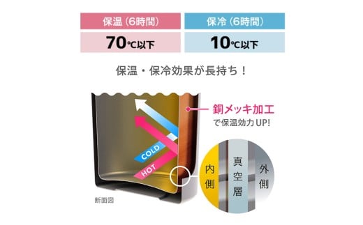 真空断熱構造+銅メッキ加工で保温・保冷効果が長持ち。