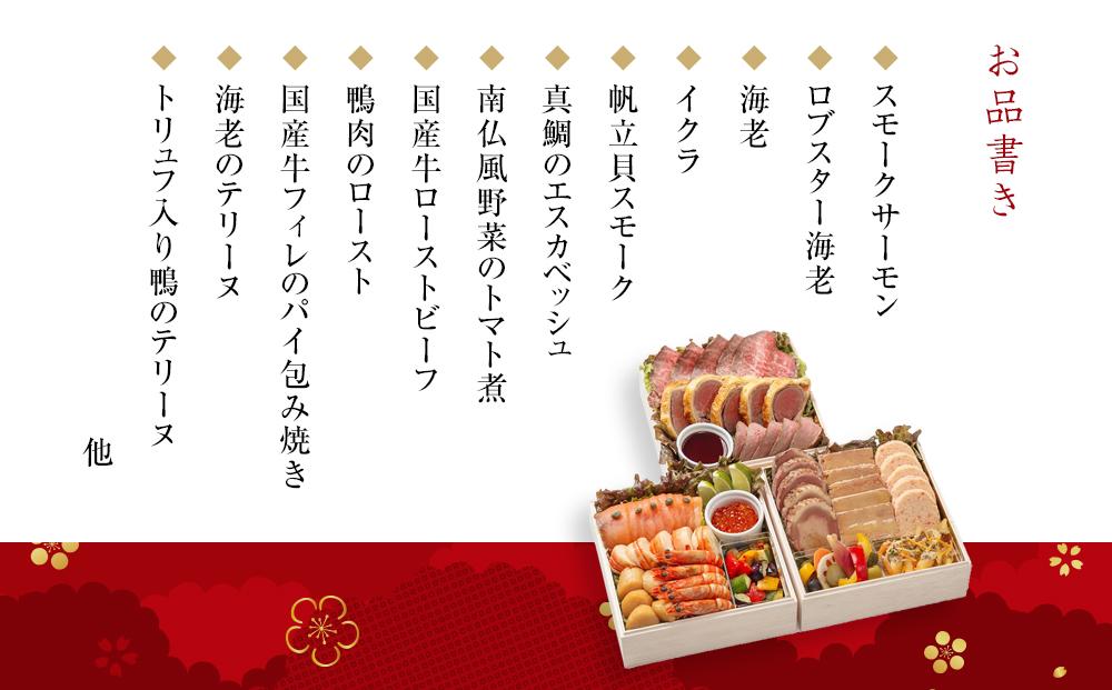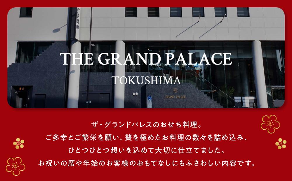 ザ・グランドパレスのおせち料理。ご多幸とご繁栄を願い、贅を極めたお料理の数々を詰め込み、ひとつひとつ想いを込めて大切に仕立てました。お祝いの席や年始のお客様のおもてなしにもふさわしい内容です。