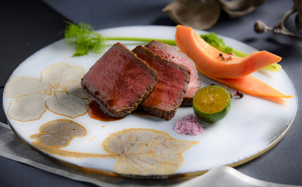 特許技術製法で焼き付けた、村花であるゆうなの花や豊かな自然をそのままガラス作品へと閉じ込めました。食材を引き立て特別な一皿として料理を提供し、また、インテリア雑貨として額装飾品などをご提案しています。