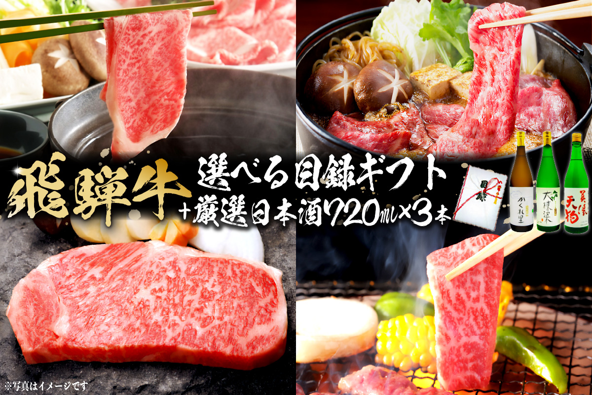 とっておきの美味しい飛騨牛を選択できる目録ギフトとフルーティーな日本酒の豪華セットです!