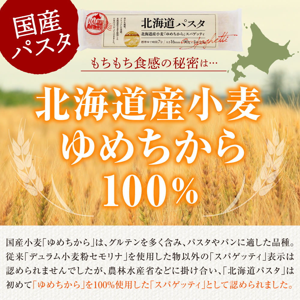 「北海道パスタ」は、北海道産小麦(ゆめちから)を使った日本発の国産スパゲッティです。弾けるようなプリッとした弾力、滑らかなのど越し、国産小麦特有の適度な粘りと、小麦のさわやかな風味が、今までに食べたことのない感動を与えてくれます。