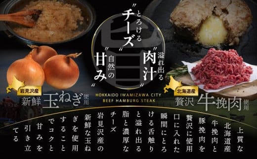 ハンバーグ:【130g/1個】合挽肉(牛肉7:豚肉3)、パン粉、牛乳、塩、ナツメグ、ブラックペッパー、ナチュラルチーズ、卵、玉ねぎ(岩見沢産)、マヨネーズ(食用植物油脂(国内製造)、卵黄、醸造酢、食塩、香辛料/調味料(アミノ酸)、香辛料抽出物、(一部に卵・大豆・りんごを含む))、ケチャップ(トマト(輸入又は国産(5%未満))、糖類(砂糖・ぶどう糖果糖液糖、ぶどう糖)、醸造酢、食塩、たまねぎ、香辛料)