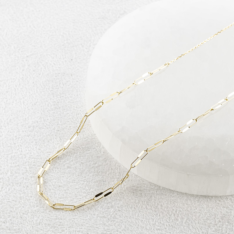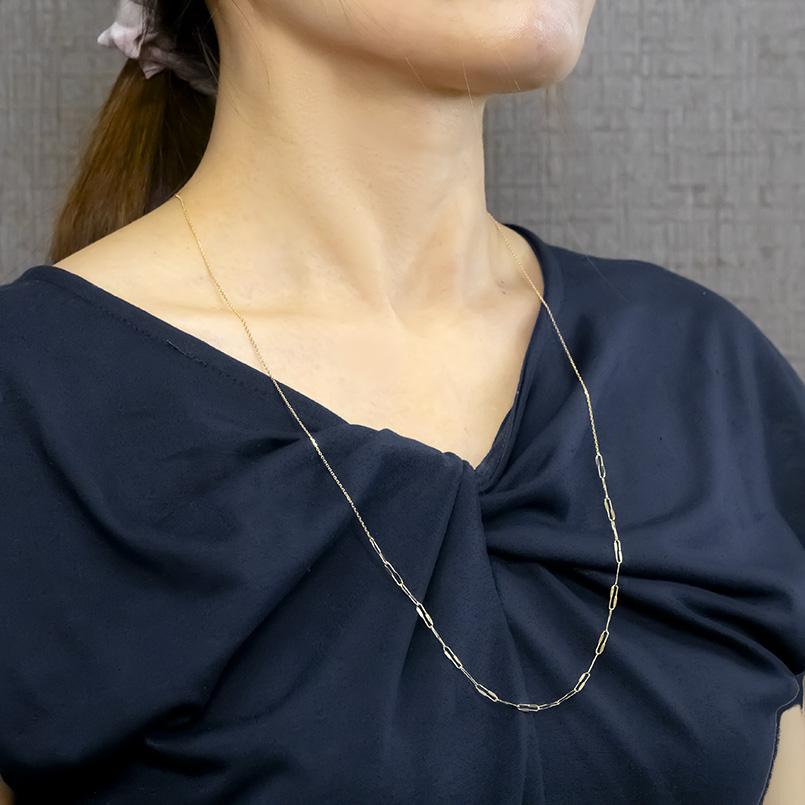 K18ハーフプレスチェーンが首元に輝きを添え、装いを華やかに演出