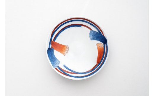 赤と青の房のついた組紐文は特に細線で引き連ねた房や房の端の点描文様に特徴があります。組紐の『結ぶ』転じて『縁結び』の意味がある吉祥柄文様でもあり、そのためお祝いのお品としても喜ばれています。