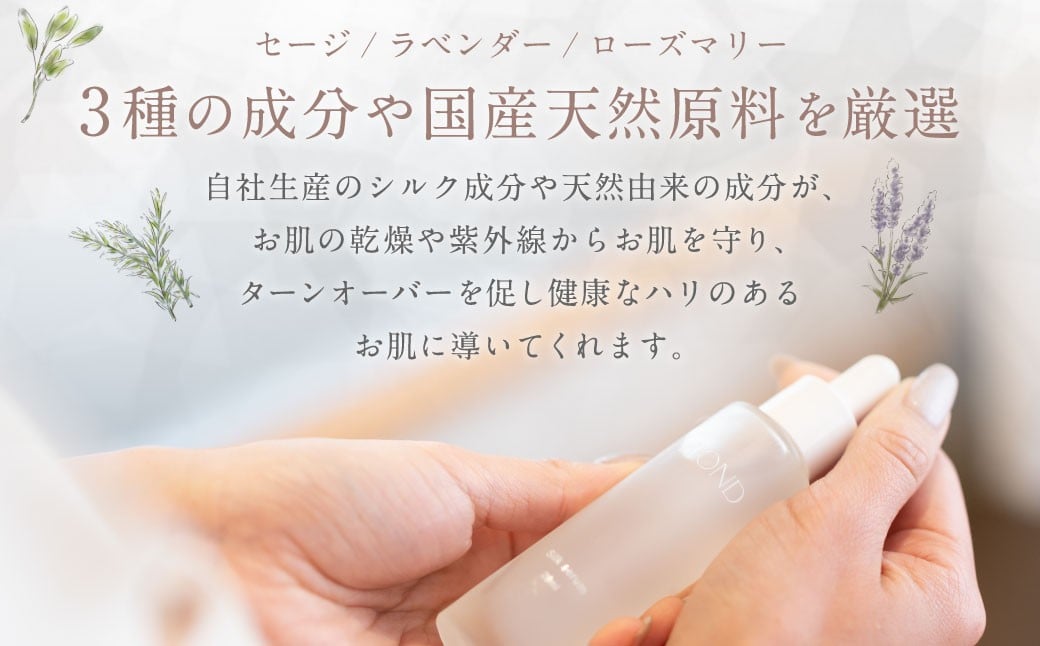 国産植物成分(レモン、茶葉、梅)や3種の成分(セージ、ラベンダー、ローズマリー)に加えて、乾燥を防ぐヒアルロン酸Naやハトムギ種子エキスも配合し、加齢で遅れがちなターンオーバーを整え、健やかでうるおいに満ちた美しい肌へと導きます。