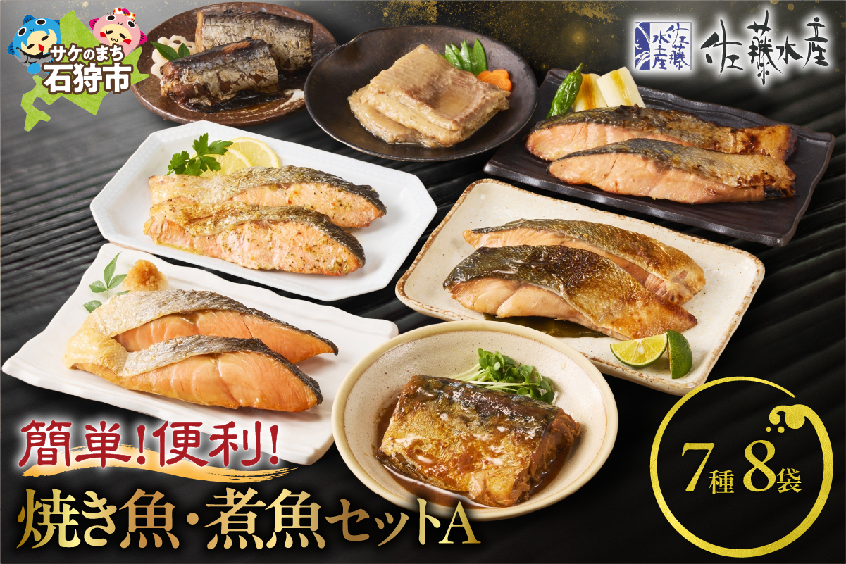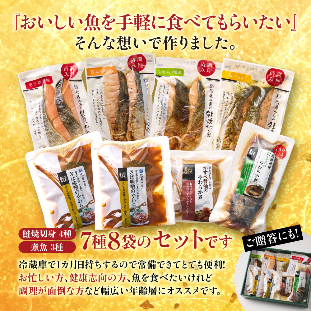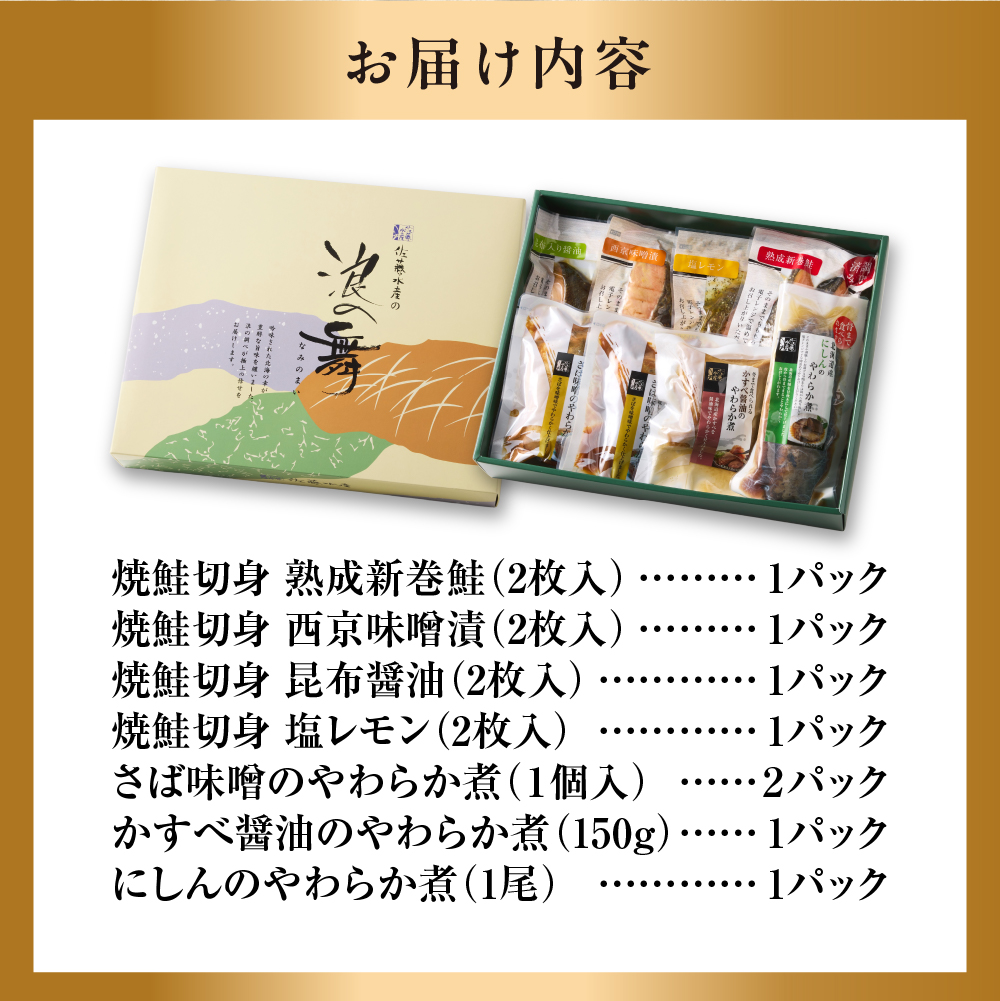 焼鮭切身熟成新巻鮭、焼鮭切身昆布醤油、焼鮭切身塩レモン、焼鮭切身西京味噌漬 各2枚入各1P、さば味噌やわらか煮1個入×2P、かすべ醤油のやわらか煮150g×1P、にしんのやわらか煮1尾×1P