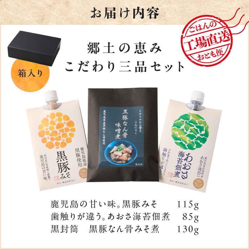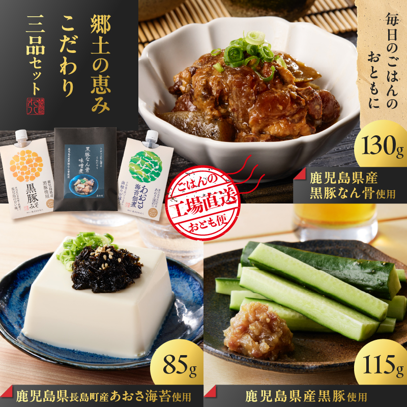 黒豚みそとあおさ海苔佃煮はごはんのおともに。黒豚なん骨みそ煮は5分ほど湯煎してお召し上がり下さい。