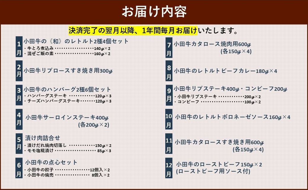 - 決済完了の翌月以降、1年間毎月お届けいたします。