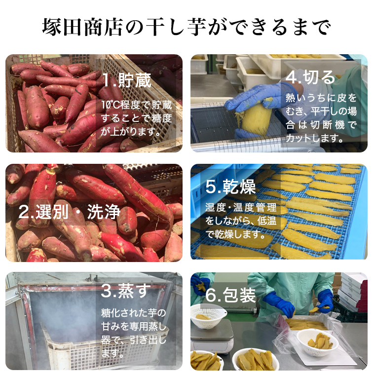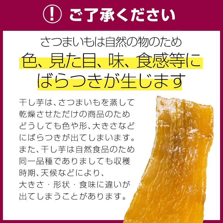 干し芋は自然食品の為、同一品種でも収穫時期、天候等により、大きさ、形、硬さ等に違いが出てしまう事があります。白い粉は干し芋に含まれる麦芽糖が結晶化したものです。芋の皮やひげ根の付着、繊維や黒ずみが見られることがありますが、いずれも品質には問題御座いませんので、ご安心してお召し上がり下さい。