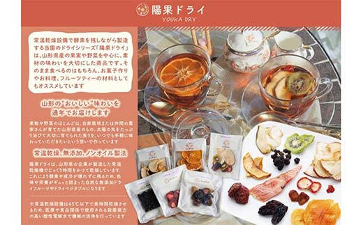 太陽の光をいっぱいに浴びた山形県産の果物をドライフルーツに自社加工。