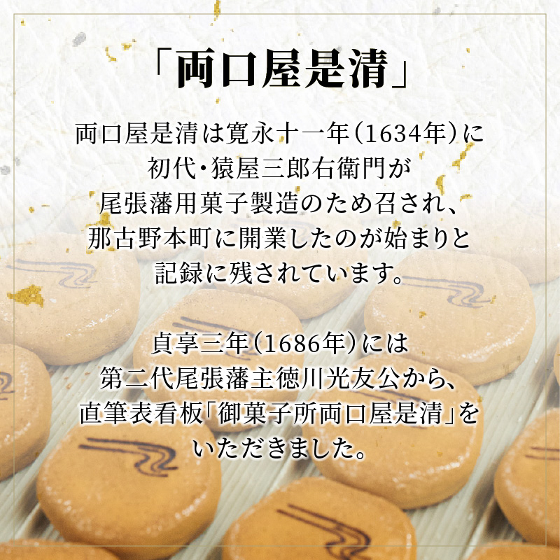 両口屋是清は寛永十一年(1634年)に初代・猿屋三郎右衛門が尾張藩用菓子製造のため召され、那古野本町に開業したのが始まりと記録に残されています。