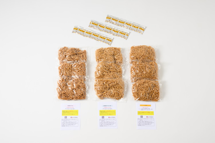 ・細麺焼きそば:小麦粉(北海道)、塩、植物油脂/酒精、かんすい、(原材料の一部に小麦、大豆を含む)