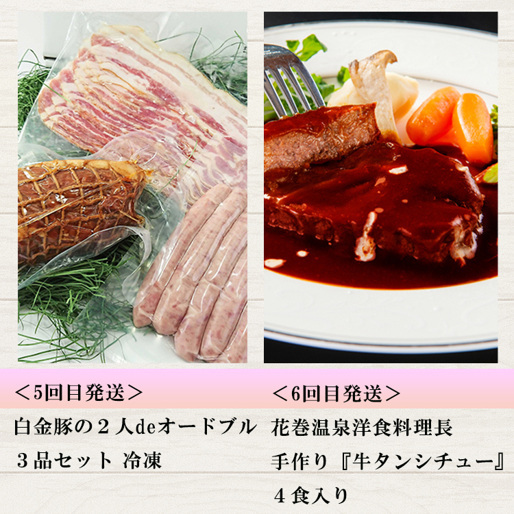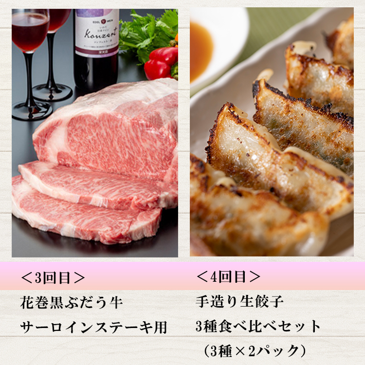 鶏肉、豚肉、牛肉の3拍子が揃ったブランド肉、地元産食材にこだわった手作り餃子、本格ホテルのこだわりの牛タンシチューを定期便でお届けします。