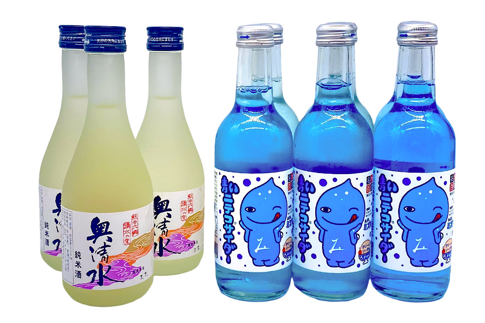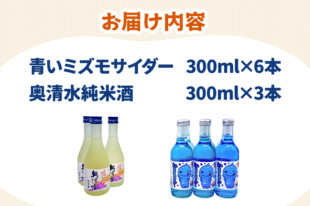 ■内容量:青いミズモサイダー1本300ml×6本、奥清水純米酒300ml×3本