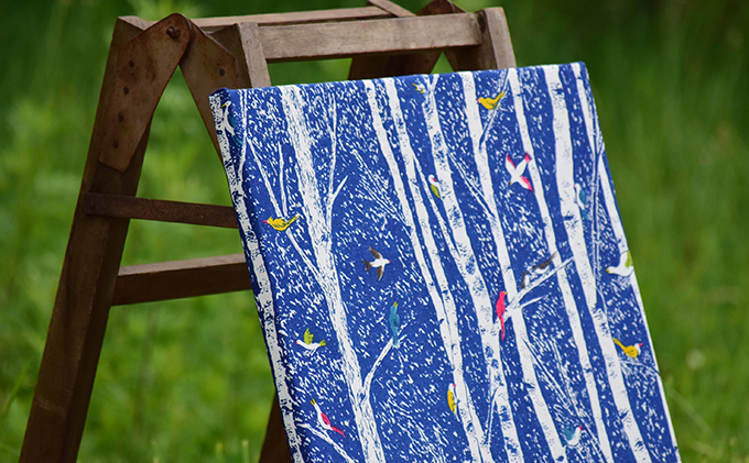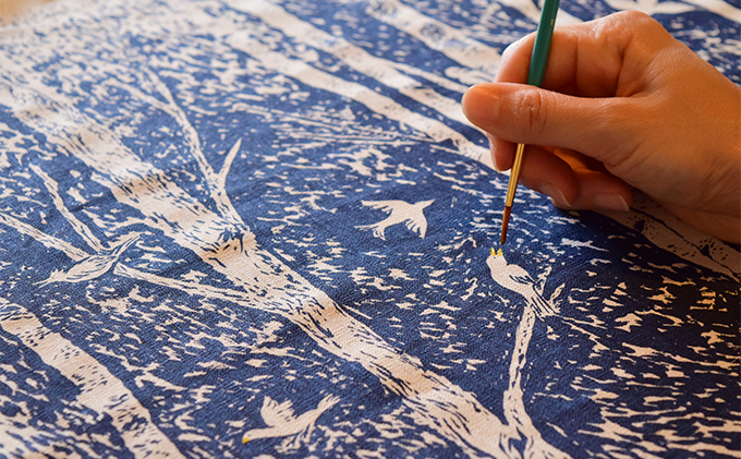 こちらの作品は全体の白樺と鳥の柄をプリントした後に、鳥を筆で色挿し、その後に蒸しと洗いの工程をしています。