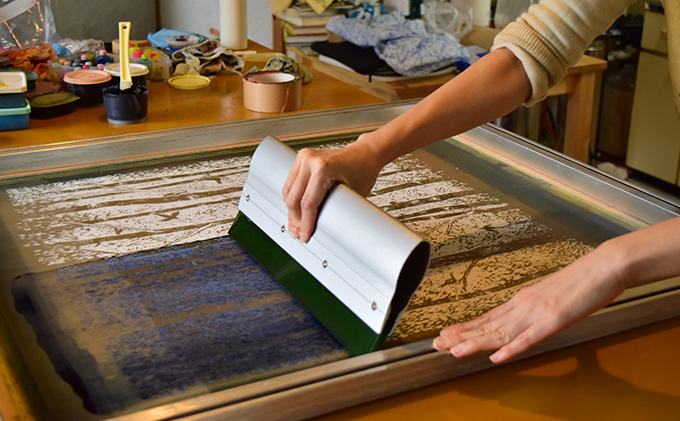 型のデザイン、製版からプリント、蒸し、洗いまで、一人で行っています。