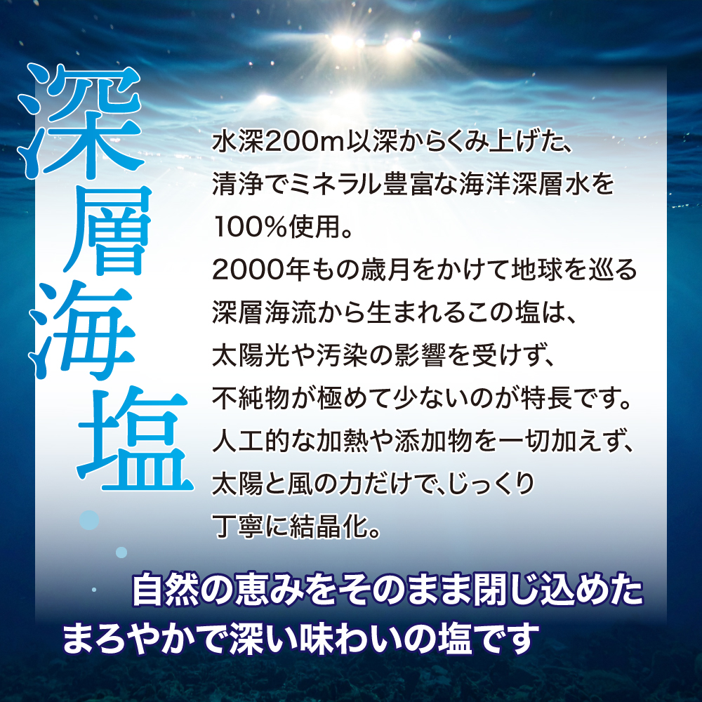 2000年もの歳月をかけて地球を巡る深層海流から生まれるこの塩は、太陽光や汚染の影響を受けず、不純物が極めて少ないのが特長です。