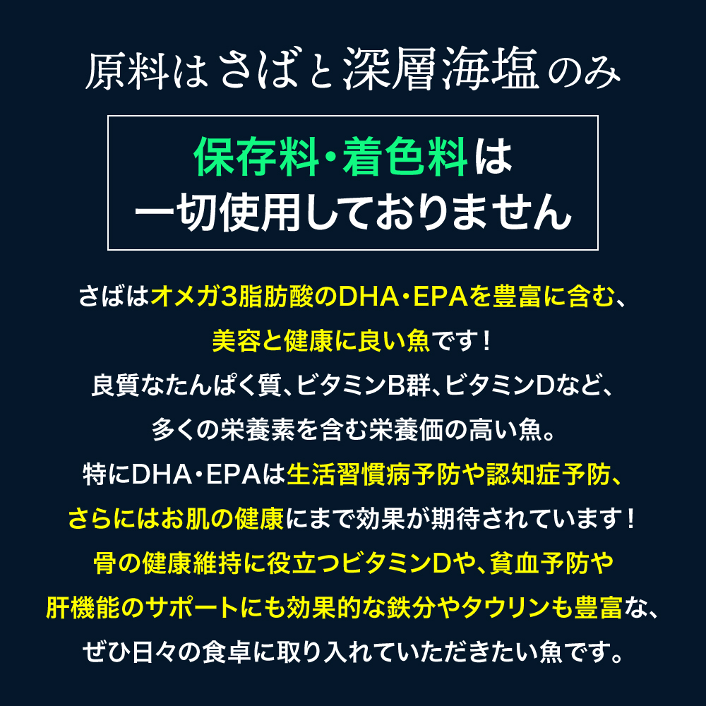 原料はさばと深層海塩のみ。保存料・着色料は一切使用しておりません。