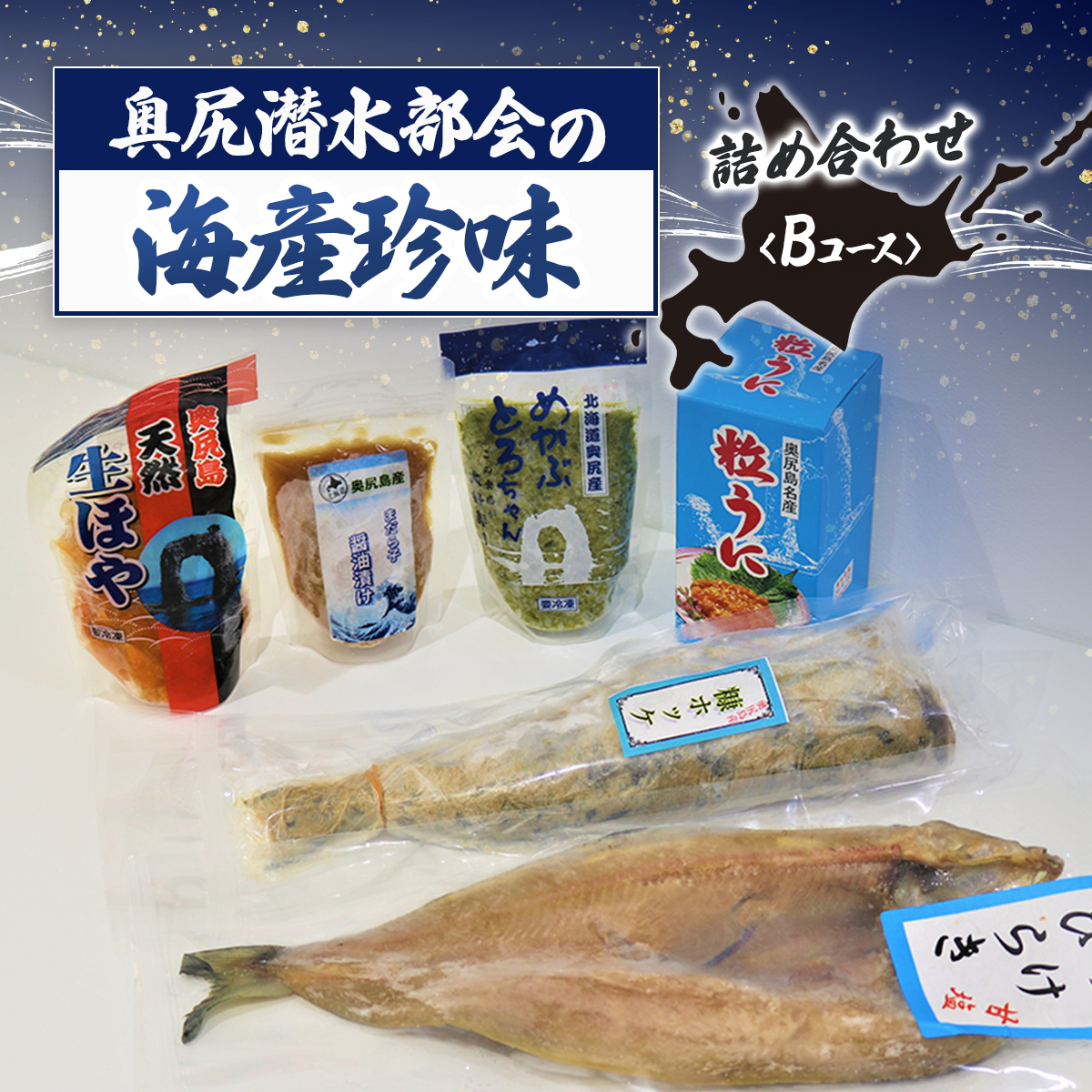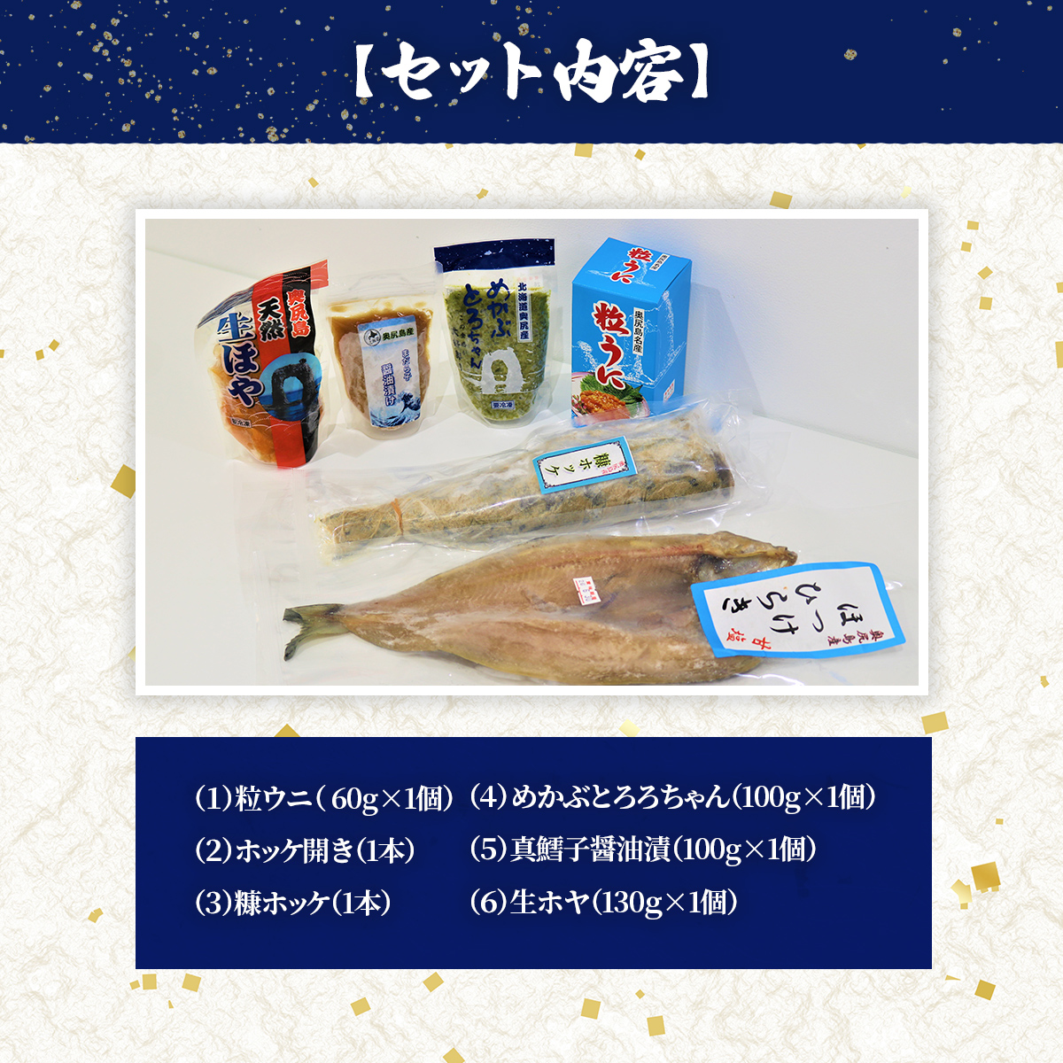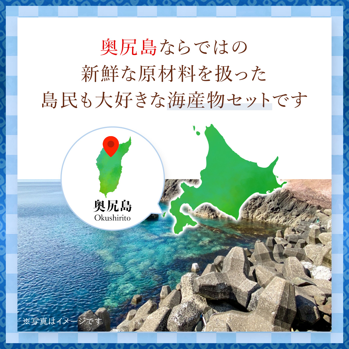 奥尻島近海で獲れた新鮮な魚介類の加工品セットです。