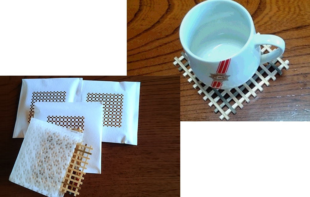 五城目の木工職人手作りの組子コースターです。天然秋田杉と神代杉の組み合わせです。組子を楽しむと共に、パッケージを開いた時の木の香りも楽しんで下さい。格子になっているので水滴が付いても持ち上がる事がありません。