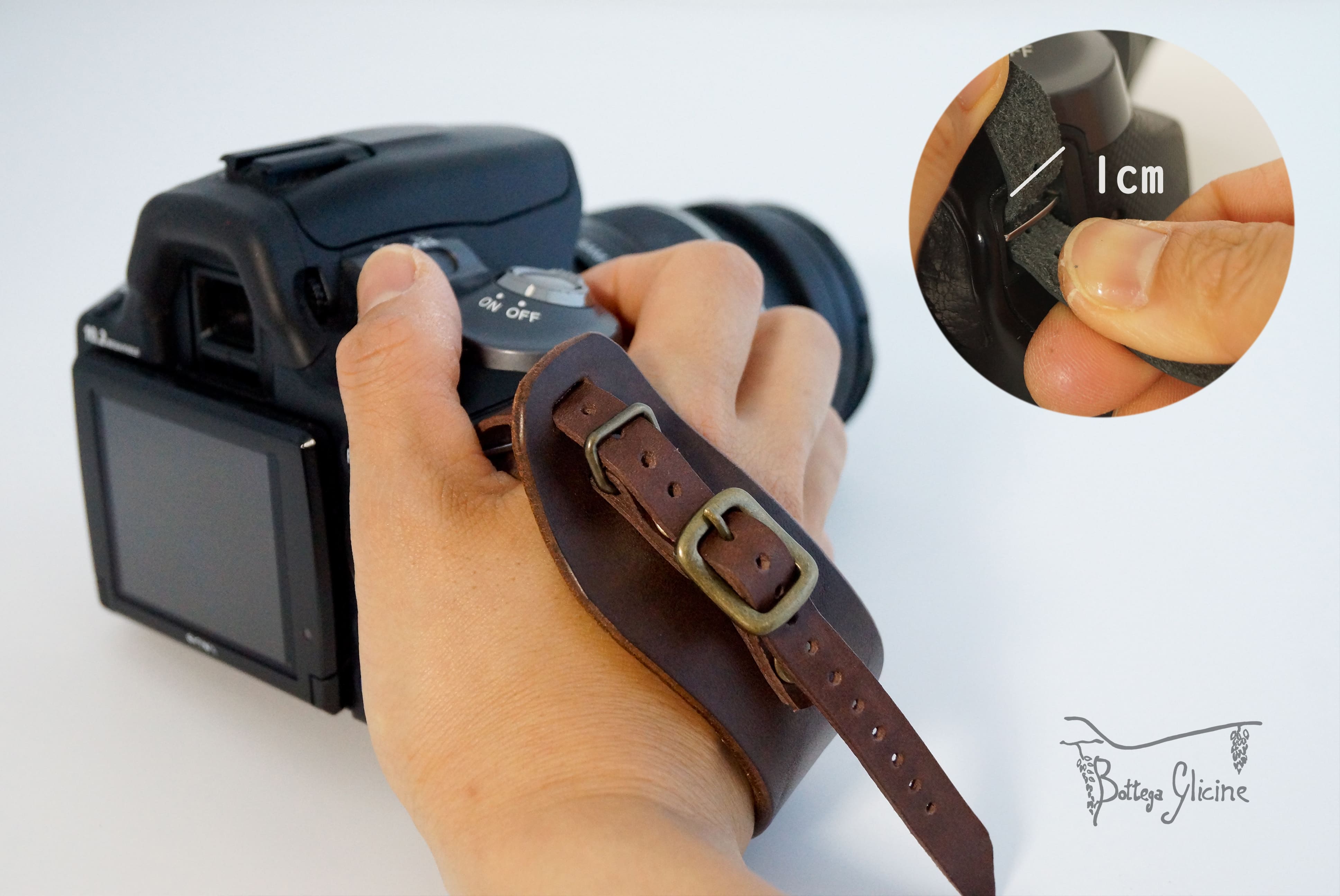 カメラ本体のストラップ通し口と、三脚の穴利用して装着します。ベルト幅は約10mm。お手持ちのカメラの通し口(幅)をご確認ください。