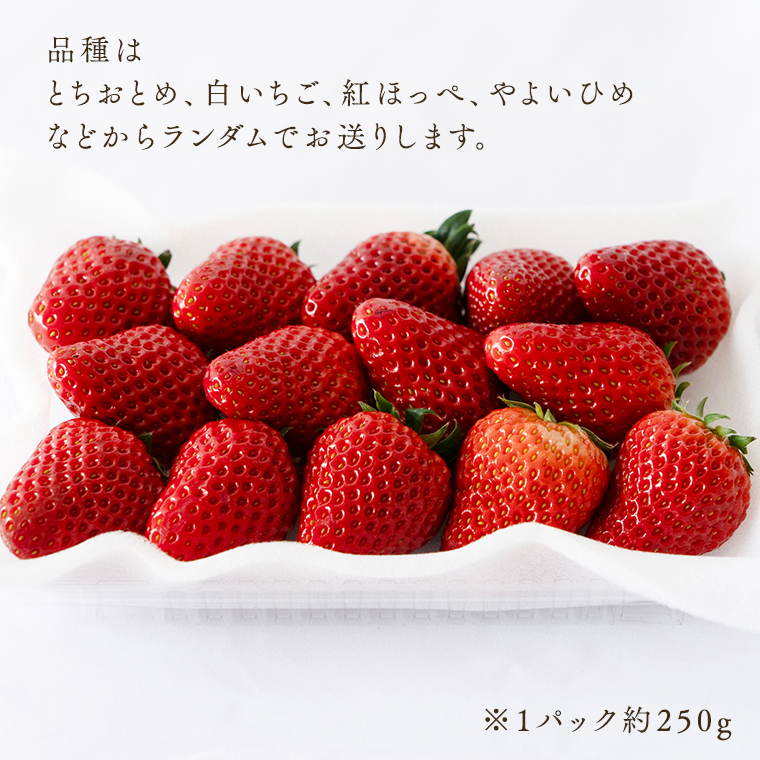 品種はランダムになります。(とちおとめ、白いちご、紅ほっぺ、やよいひめ などから)