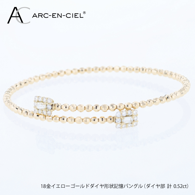 18金YG ダイヤモンド 形状記憶 バングル/ダイヤ計 0.52ct/形状記憶チタン線使用/ミラーボール2.5mm使用/ダイヤ部:縦約7.0mm、幅約5.4mm、厚さ約3.8mm/【対応サイズ】Mサイズ;内径 約148mm、Lサイズ;内径 約170mm/※サイズは備考欄へ御記載ください/宝石鑑別団体協議会(A.G.L)会員 鑑別機関の鑑別書付き