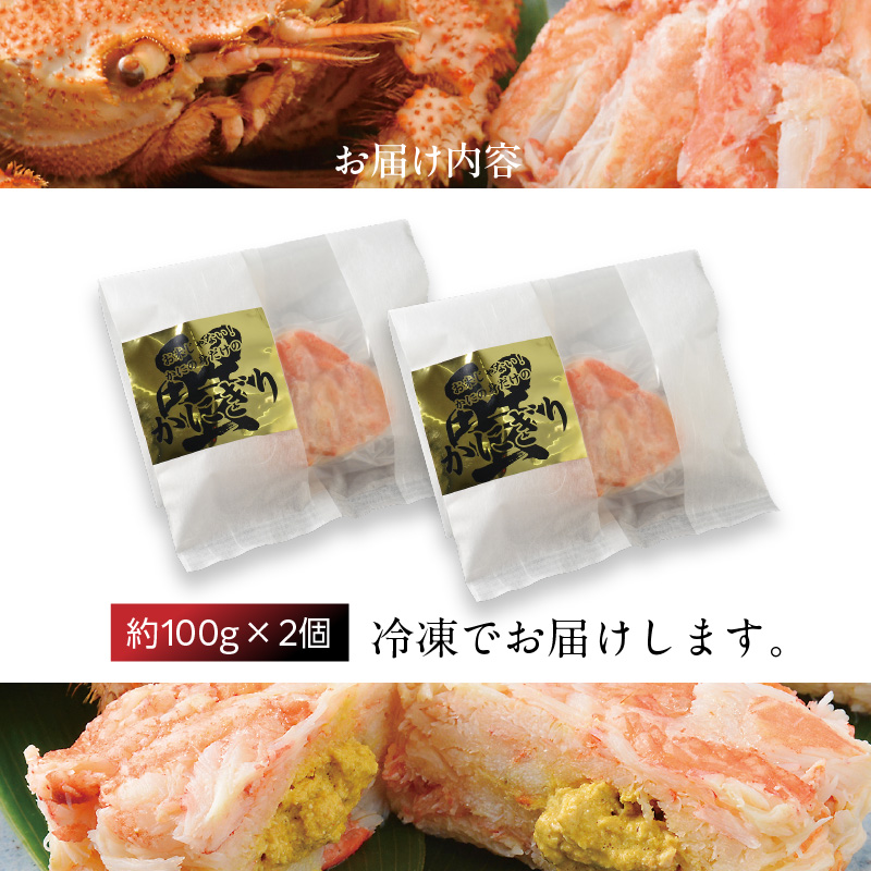 当店で活ゆでした毛蟹をひとつひとつ丁寧にむき、そのむいた毛蟹の身をおにぎりの形に握り、具にはかにみそが入った当店オリジナル!!毛蟹100%!!自然解凍するだけで美味しい毛蟹をむかずにすぐ食べられます。もっと早く食べたいときは、5分湯煎するだけで美味しい毛蟹を食べることができます。