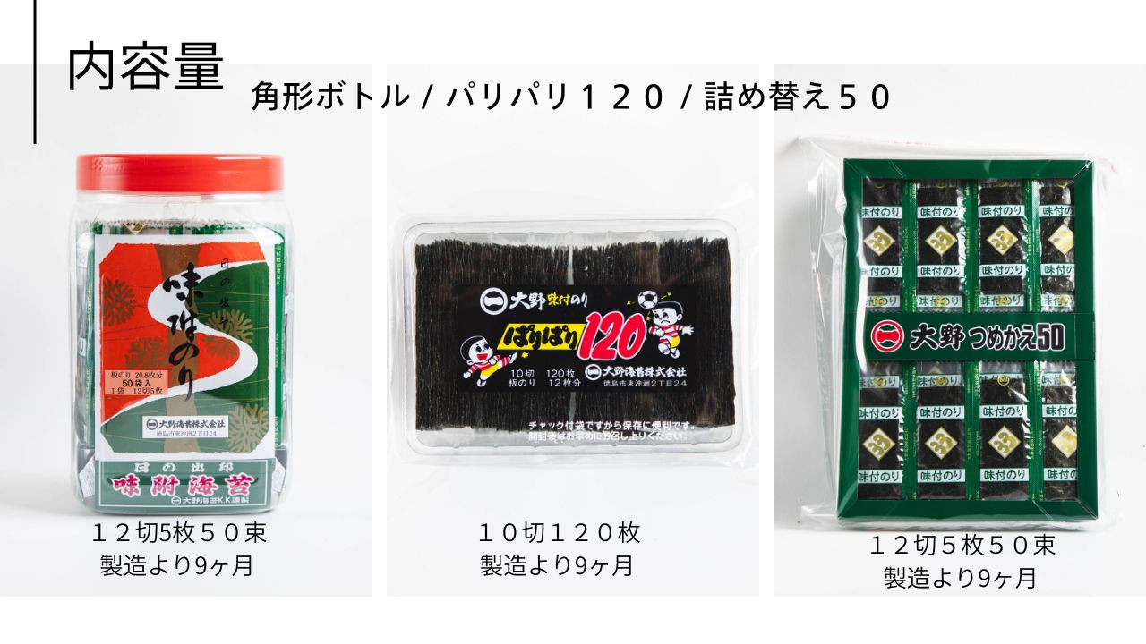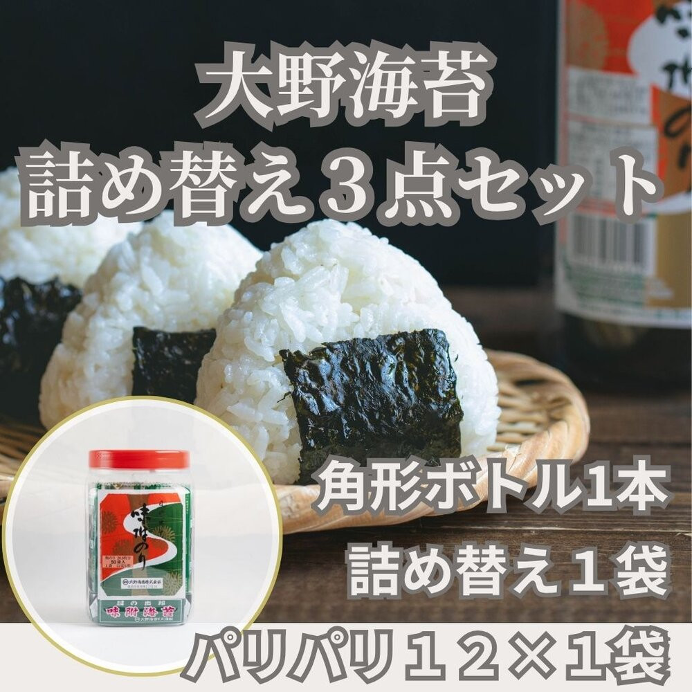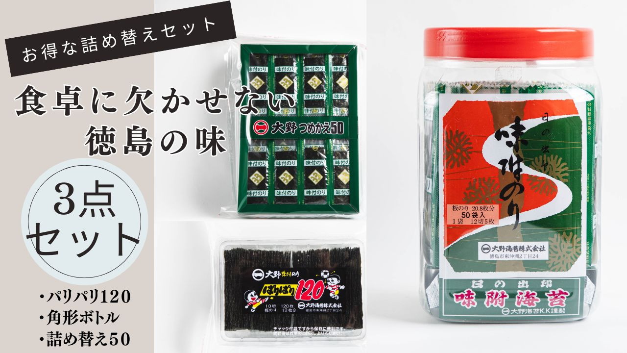 徳島で親しまれる大野海苔シリーズを詰め合わせた特別なセットです。香ばしい味付けとパリッとした食感が魅力の「パリパリ120」使いやすく保存にも便利な角形ボトル。たっぷり楽しめる詰め替え用を組み合わせた人気の返礼品です。毎日のご飯やお弁当にピッタリの内容です。
