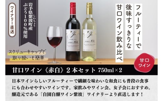 フルーティーで後味すっきりな自園自醸ワイン紫波の人気の甘口ワインを、赤ワイン・白ワインの2本飲み比べセットでお届けします。