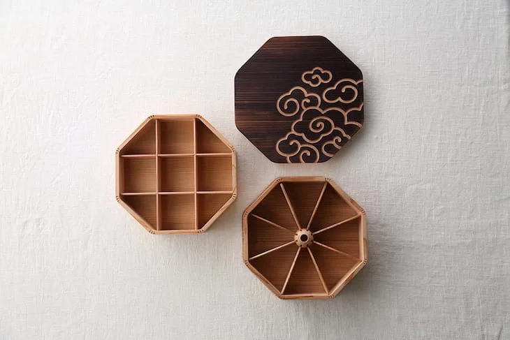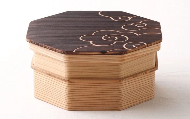 八角二段お弁当箱「焼杉の黒刻」-[hak107]