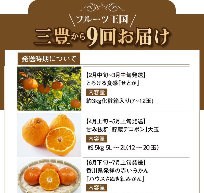 その中でもあまり数が収穫できない上位ランクのフルーツを、それぞれ旬の時期に1年間9回お届けします。