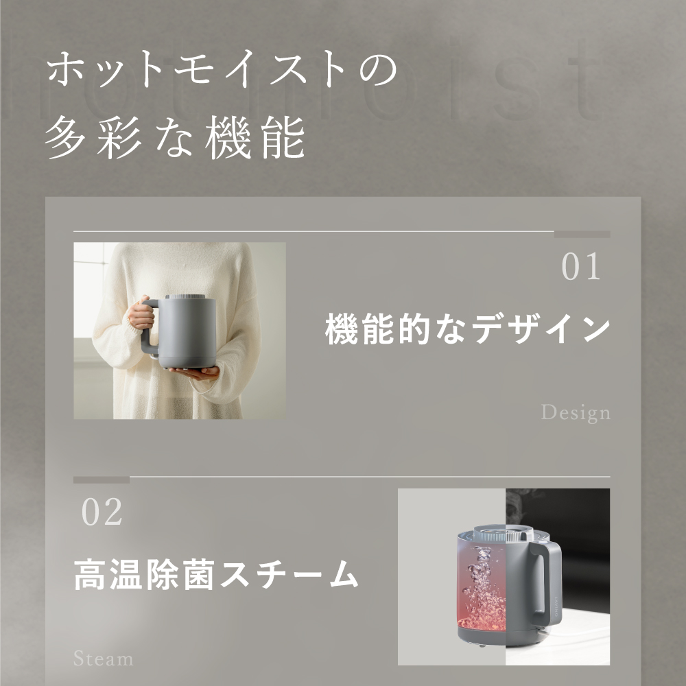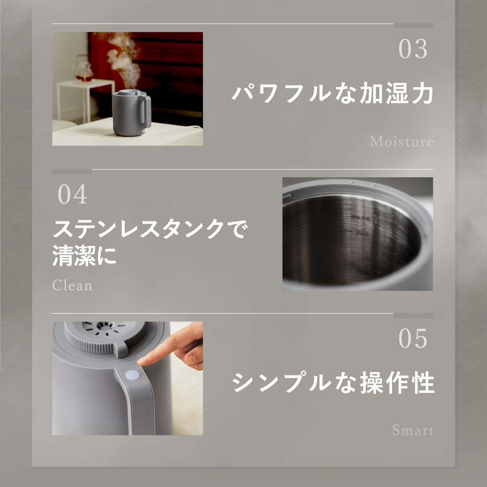 水が高温殺菌されているため、清潔な蒸気で加湿できるのが魅力。