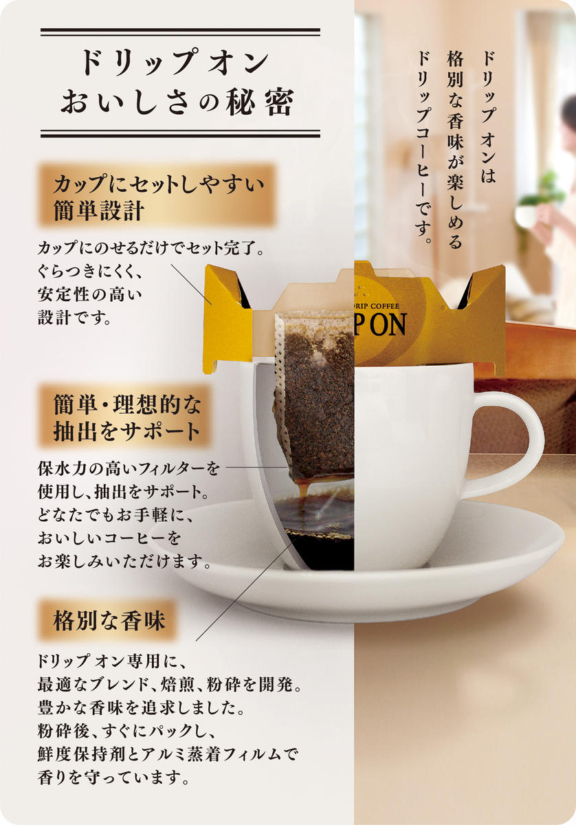カップにセットしてお湯を注ぐだけで、手軽に本格コーヒーが楽しめるドリップオン。