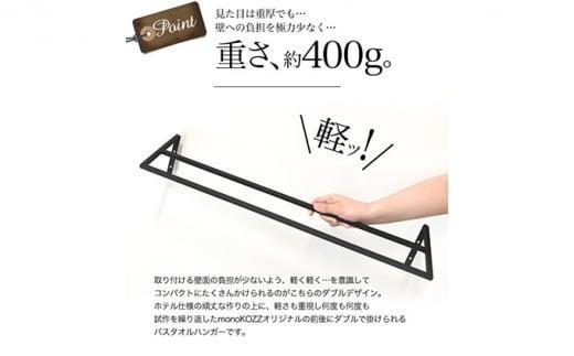 monoKOZZオリジナル。職人とデザイナーのこだわりが詰まった【アイアンダブルタオルハンガー600mmストレートタイプ】。1本でダブルに掛けられる、ホテルのような高級感あるバスタオルハンガーです。鉄工職人とデザイナーが造形美にこだわりぬいた逸品です。アイアンならではの高級感を保ちつつ、お取り付けの壁面への負担軽減のため軽量に仕上げています。シンプルだからこそ空間に馴染むmonoKOZZのアイアンタオルハンガーは、ワンランク上のおしゃれな空間づくりに貢献します。カラーは、高級感ある「マットブラック」。