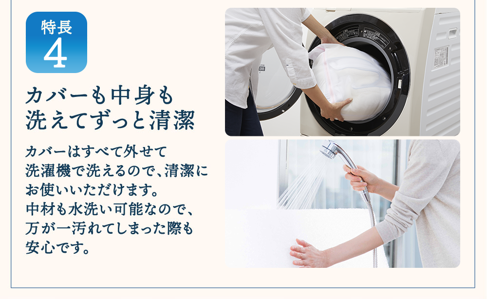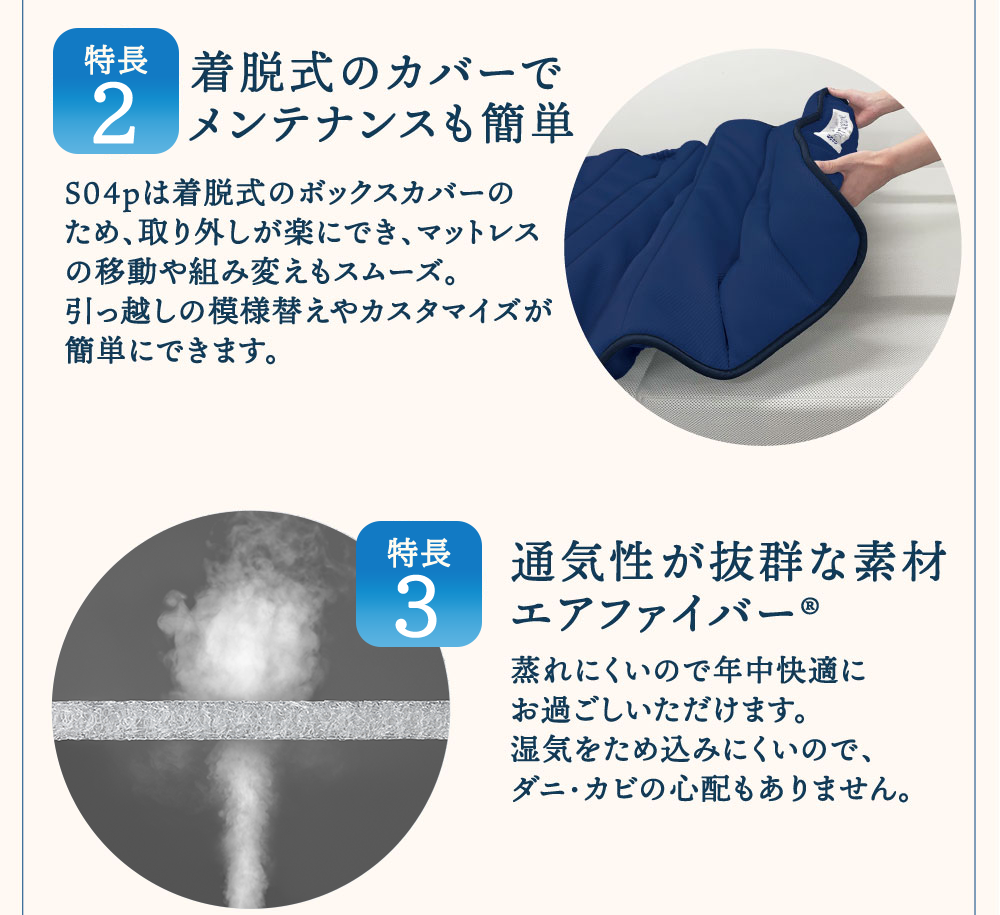 3種類の硬さを組み合わせることで、一人ひとりの体形に合わせて理想的な寝姿勢を実現します。着脱式カバーでお手入れがよりスムーズに。