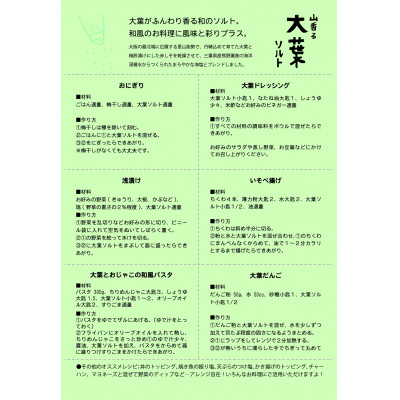 簡単なレシピをいっしょにお届けさせていただきます。能勢の山が香る大葉ソルトをぜひご賞味ください。