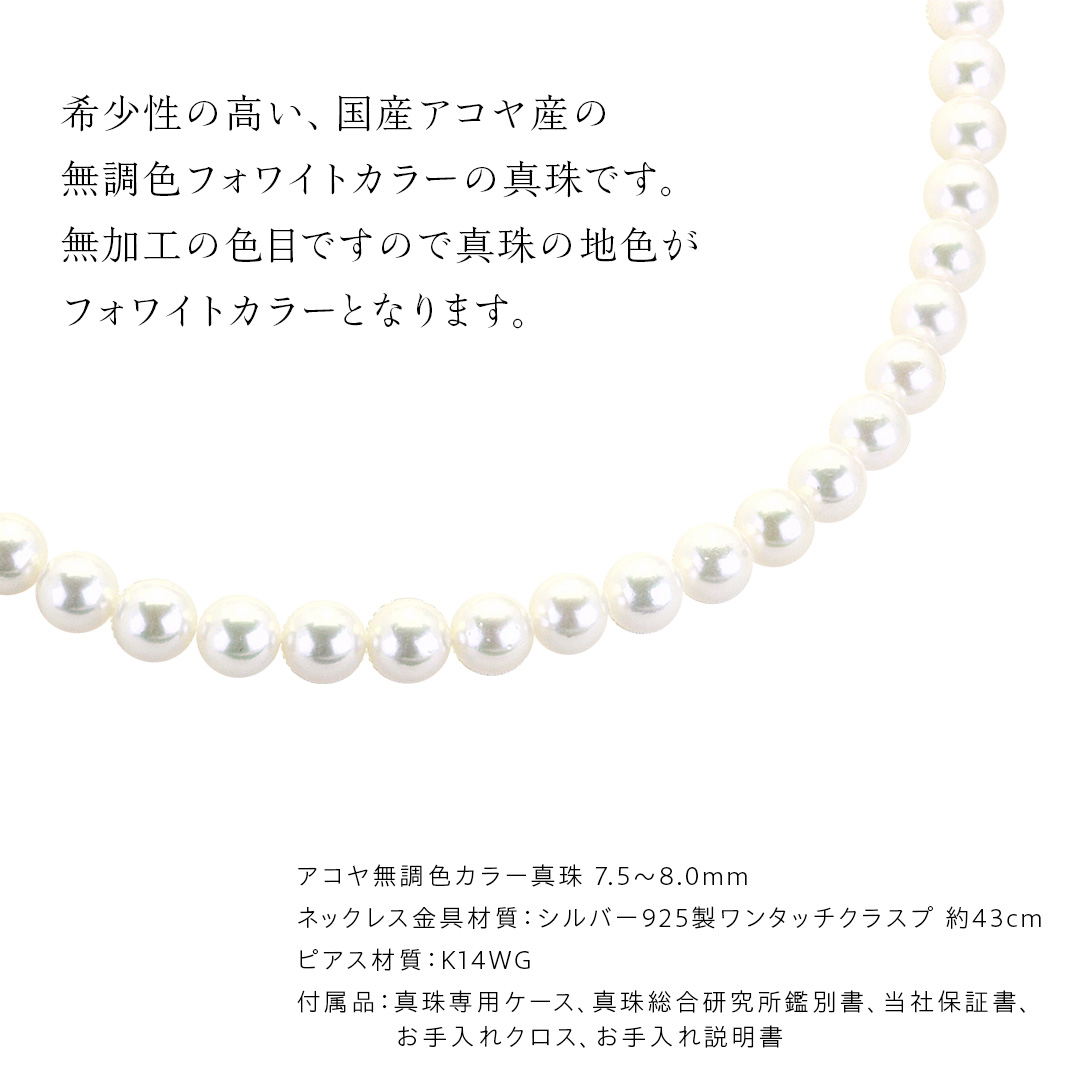 ![アコヤ真珠《 ネックレス + ピアス セット 》 パール 7.5-8.0mm 希少 国産 無調色 フォワイトカラー 真珠 結婚式 冠婚葬祭 成人祝い 結婚祝い 厄除け 真珠婚 お祝い 入学式 卒業式 プレゼント ギフト 記念 贈り物 贈答用 アクセサリー ジュエリー ジュエリーマーノ 桜川市 [AH153sa]](https://www.furusato.aeon.co.jp/g_img/082317/3446277_1753231342_square_image.webp)