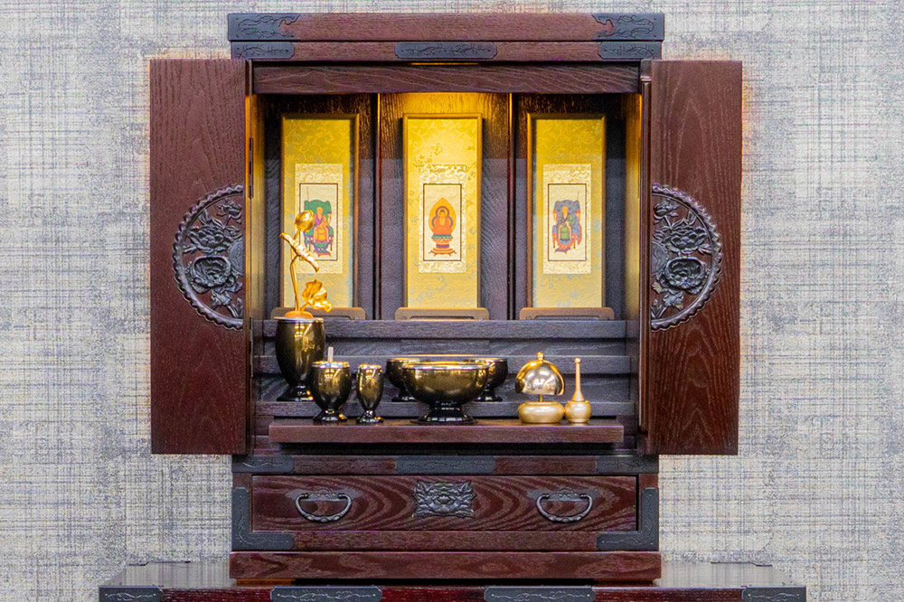 幕板や膳引(仏具を乗せる引き出し式の台)のデザインをシンプルにすることで洗練された雰囲気を醸します。