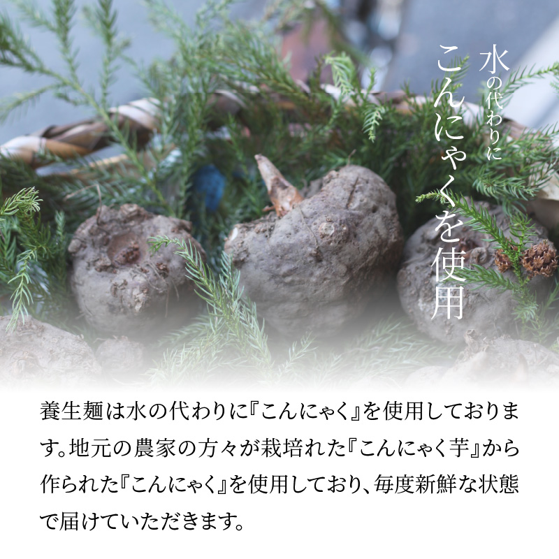 木城町こんにゃく50%使用。こんにゃく独特の臭みやクセもなく食物繊維を含んだヘルシーな麺に仕上げました。