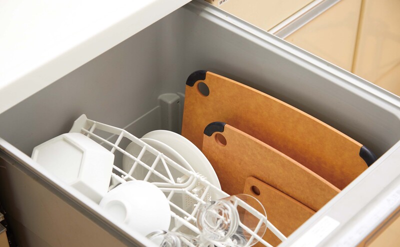 天然木の細かな繊維をギュッとプレス加工することで、細菌が入り込みにくく、高密度でなめらかな仕上がりに。耐久性にも優れており、熱湯消毒や食器洗い乾燥機にも対応します。さらに水分を吸収しにくく弾くので水切れがよく、乾きも早いため、いつでも清潔に保てます。