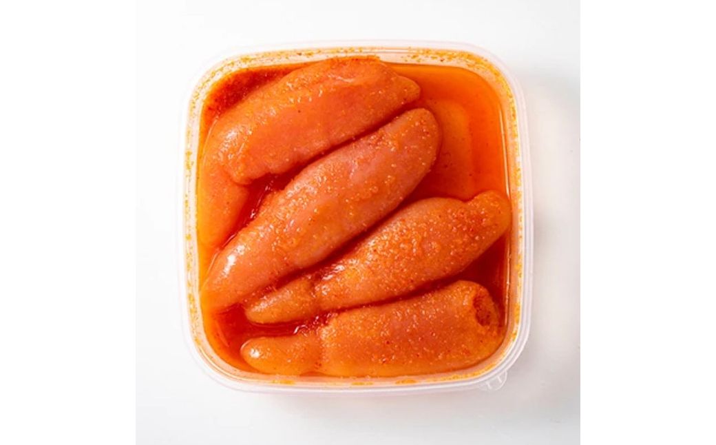 すけとうだらの卵(ロシア又はアメリカ)、食塩、焼酎、発酵調味料、唐辛子、調味料(アミノ等:小麦由来)、甘味料(ソルビット)、酵素、発色剤(亜硝酸Na)、酸化防止剤(V.C)