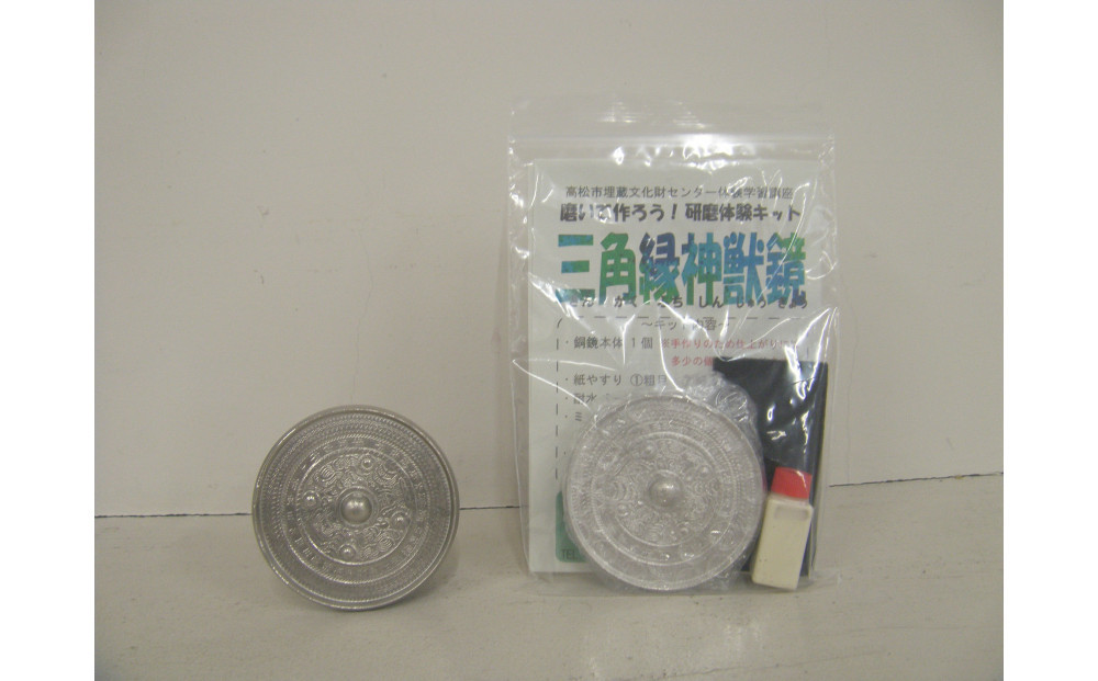 高松市縁の考古資料をモデルにした、研磨体験キット(三角縁神獣鏡×2点)をご自宅へお送りします。キットに同封された解説動画をYoutubeで視聴し、研磨体験をお楽しみください。