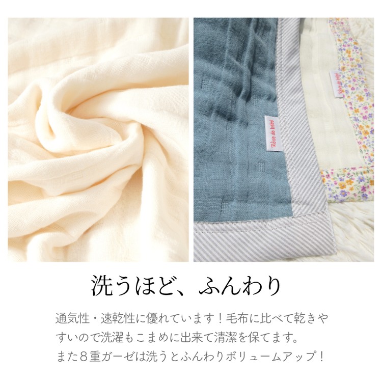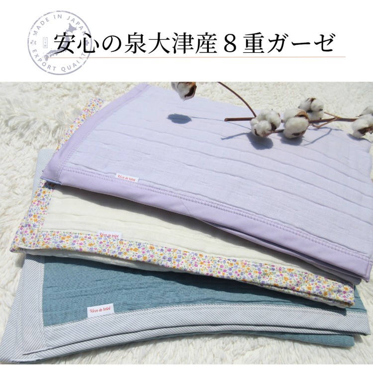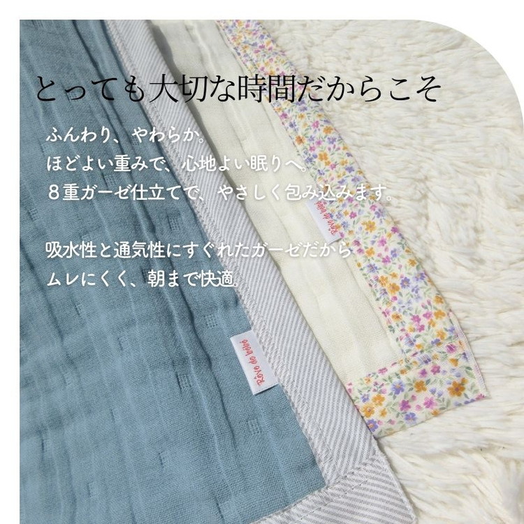 肌に触れる両表面の2枚のガーゼは、肌着と同様のガーゼ生地を使用し、内側6層のガーゼは密度を下げることで空気を含みやすくし、適度な厚みがあるため、ふんわりした肌触りよい商品です。