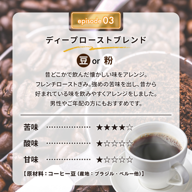 フレンチローストぎみ。強めの苦味を出し、昔から好まれている味を飲みやすくアレンジをしました。