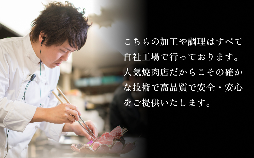 こちらの加工や調理はすべて自社工場で行っております。人気焼肉店だからこその確かな技術で高品質で安全・安心をご提供いたします。
